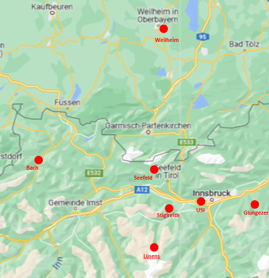 Stationen 2025 unter anderem: TAM 1 + 2 am Uni-Sportinstitut, Seefeld, Glungezer, Stiglreith, Lüsens